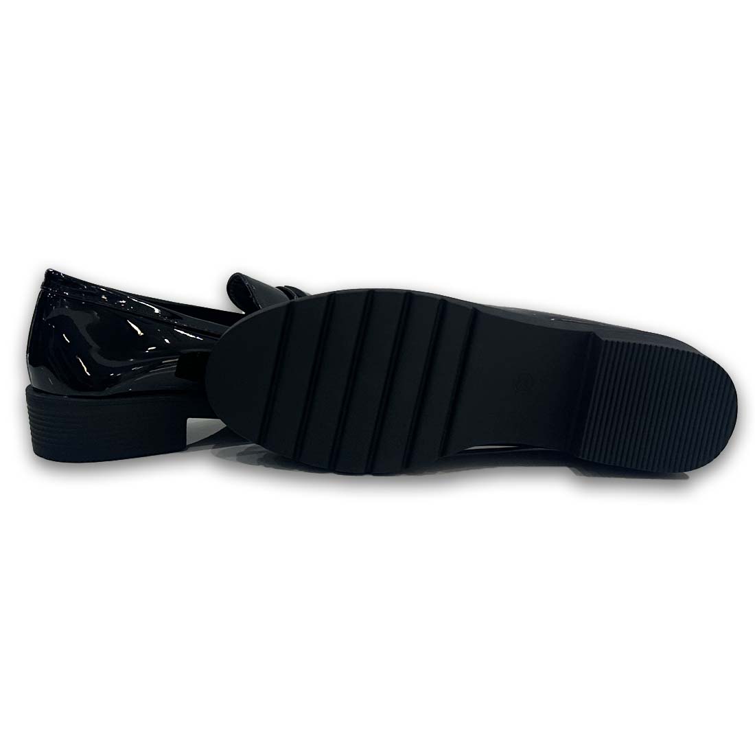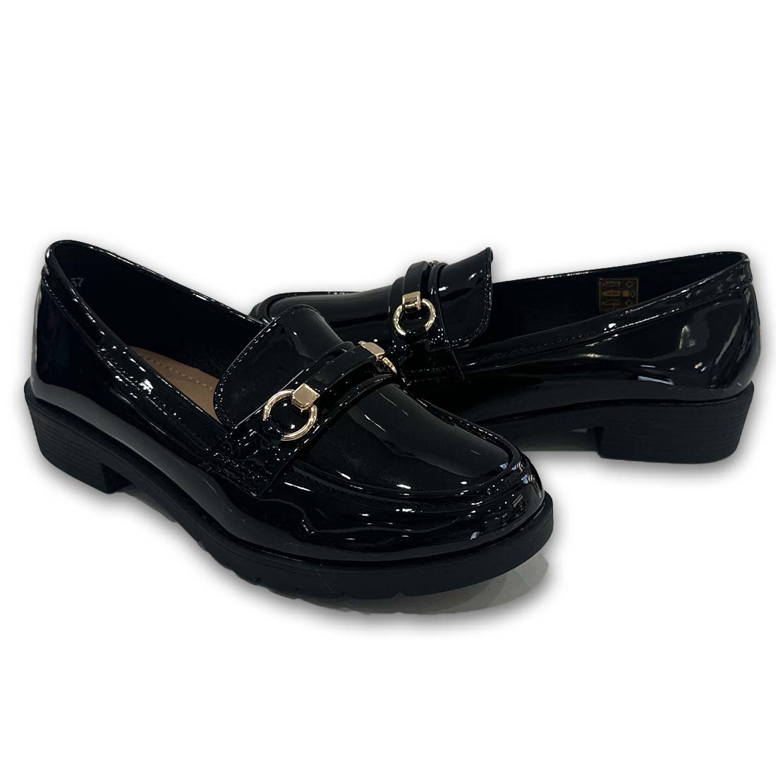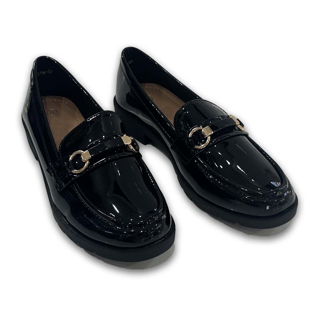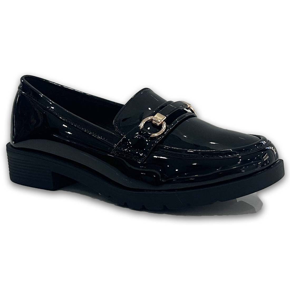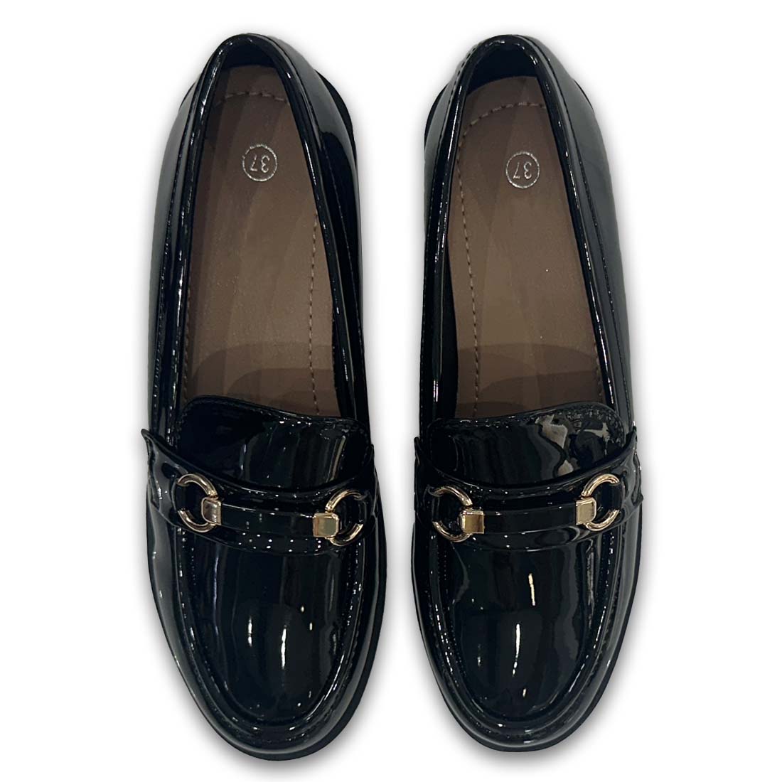 Γυναικεία μοκασίνια λουστρίνι που συνδυάζουν το κλασικό με το μοντέρνο, με διακοσμητική χρυσή αλυσίδα και αντιολισθητική σόλα.